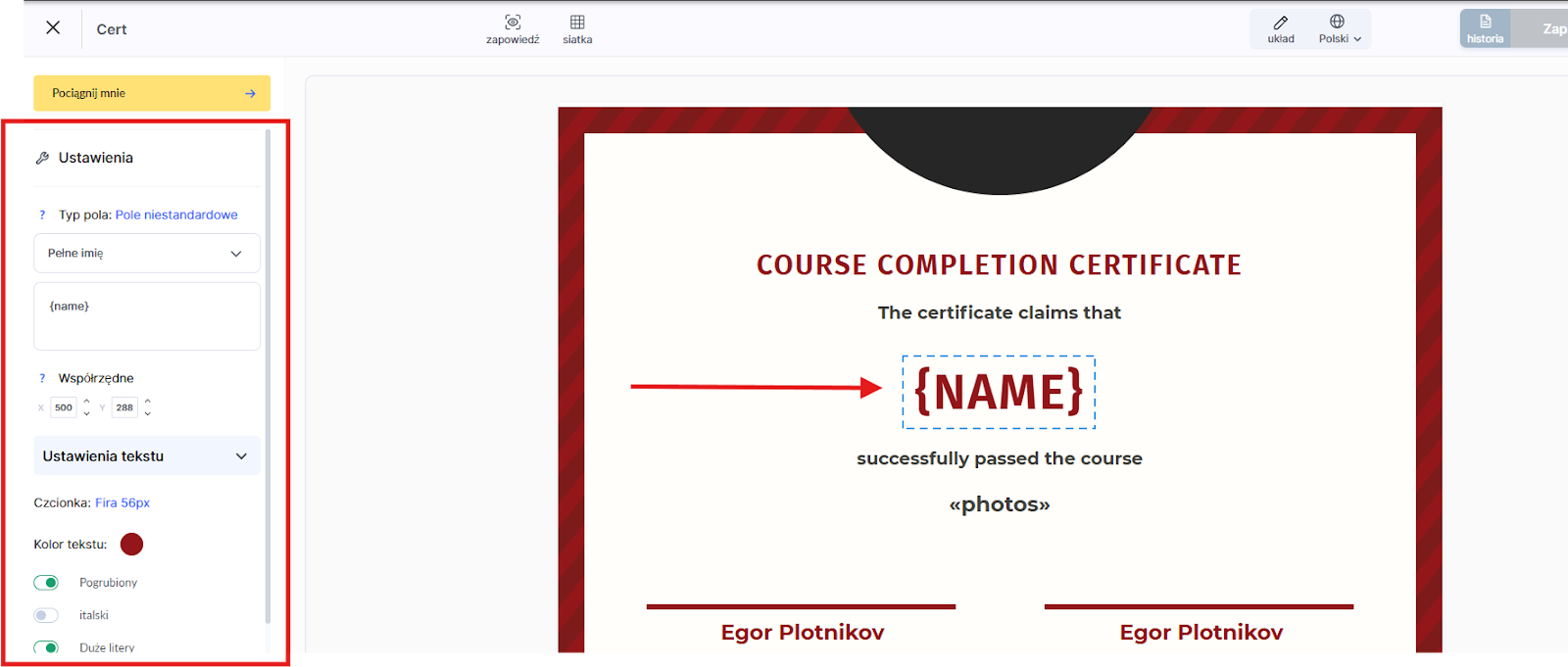 Po dodaniu lub wybraniu szablonu możesz dostosować zawartość certyfikatu.