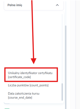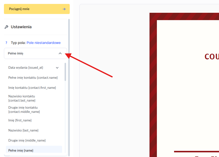 Oprócz zwykłego tekstu możesz dodać zmienną (pole niestandardowe) — czyli wybrać, jakie dane będą automatycznie wstawiane do certyfikatu w zależności od informacji o uczniu.