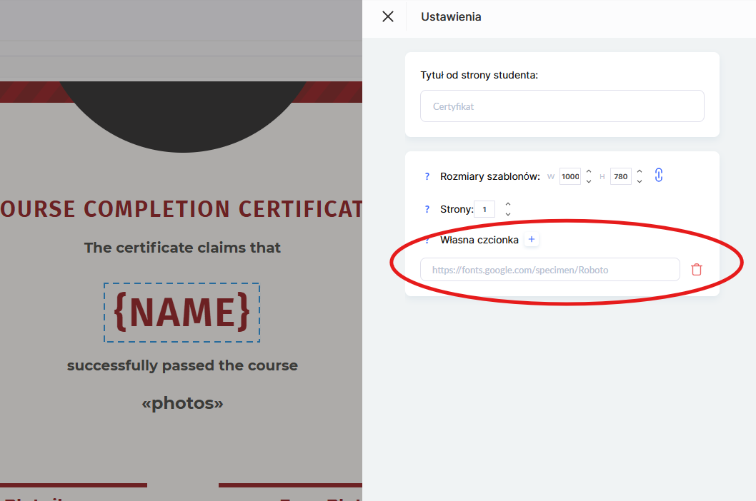 Możesz użyć własnej czcionki Google w swoich certyfikatach, podając link do wybranego fontu.