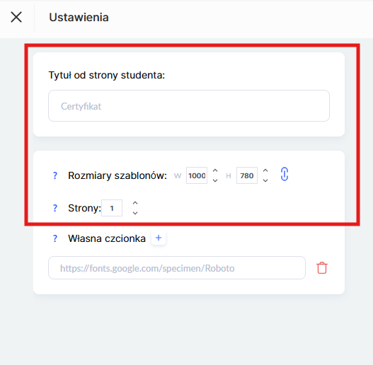 Rozmiar szablonu — ustaw wymagane wymiary szablonu w pikselach. Jest to ważne dla prawidłowego wyświetlania i pobierania certyfikatu.