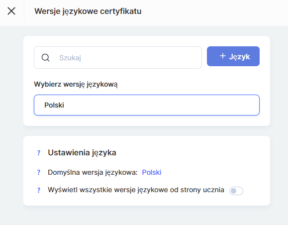 Certyfikat można skonfigurować w kilku wersjach językowych (dodając nową za pomocą przycisku +Język), niezależnie od języka samego szablonu.