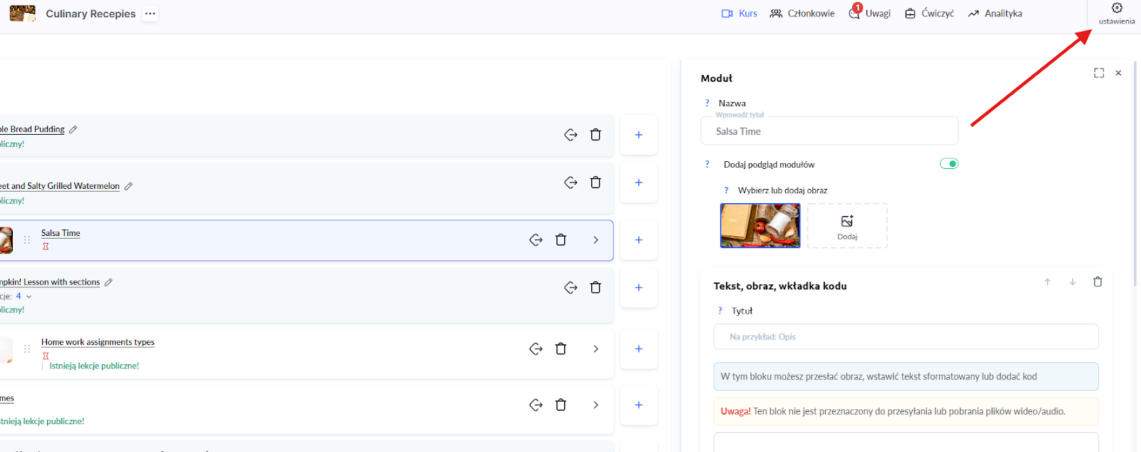 W menu Kursy znajdź odpowiedni kurs i otwórz jego Ustawienia.