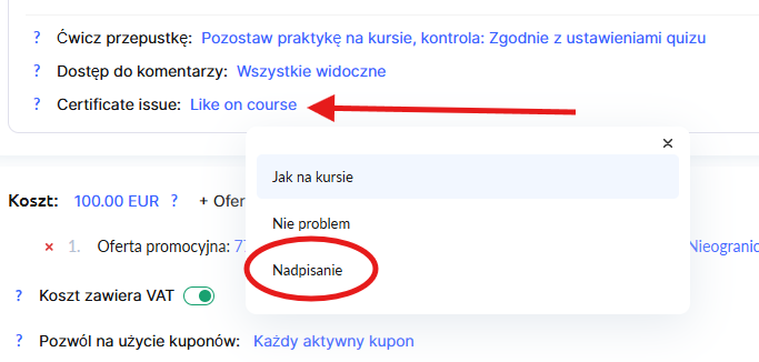 Uwaga: jeśli dla danego planu taryfowego został ustawiony oddzielny certyfikat, będzie on miał priorytet nad ogólnym certyfikatem kursu.
