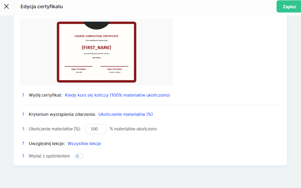 Dodaj opóźnienie (w dniach) między momentem spełnienia warunków (np. „Kurs ukończony”) a wysłaniem certyfikatu.