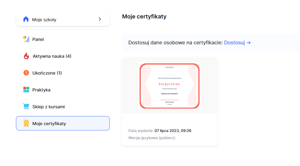 Jeśli w ustawieniach certyfikatu włączono opcję wyświetlania wszystkich wersji językowych, uczeń będzie mógł zobaczyć certyfikat w różnych językach i wybrać odpowiednią wersję językową do pobrania.