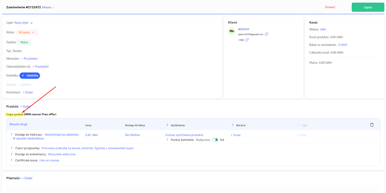 Uwaga: po wprowadzeniu zmian w zamówieniu, które zostało automatycznie utworzone po opłaceniu oferty, dla klienta tworzony jest indywidualny dostęp – to znaczy, że jego dostęp nie jest już powiązany z ofertą. Oznacza to, że dalsze zmiany w ofercie nie będą miały wpływu na dostęp tego ucznia.