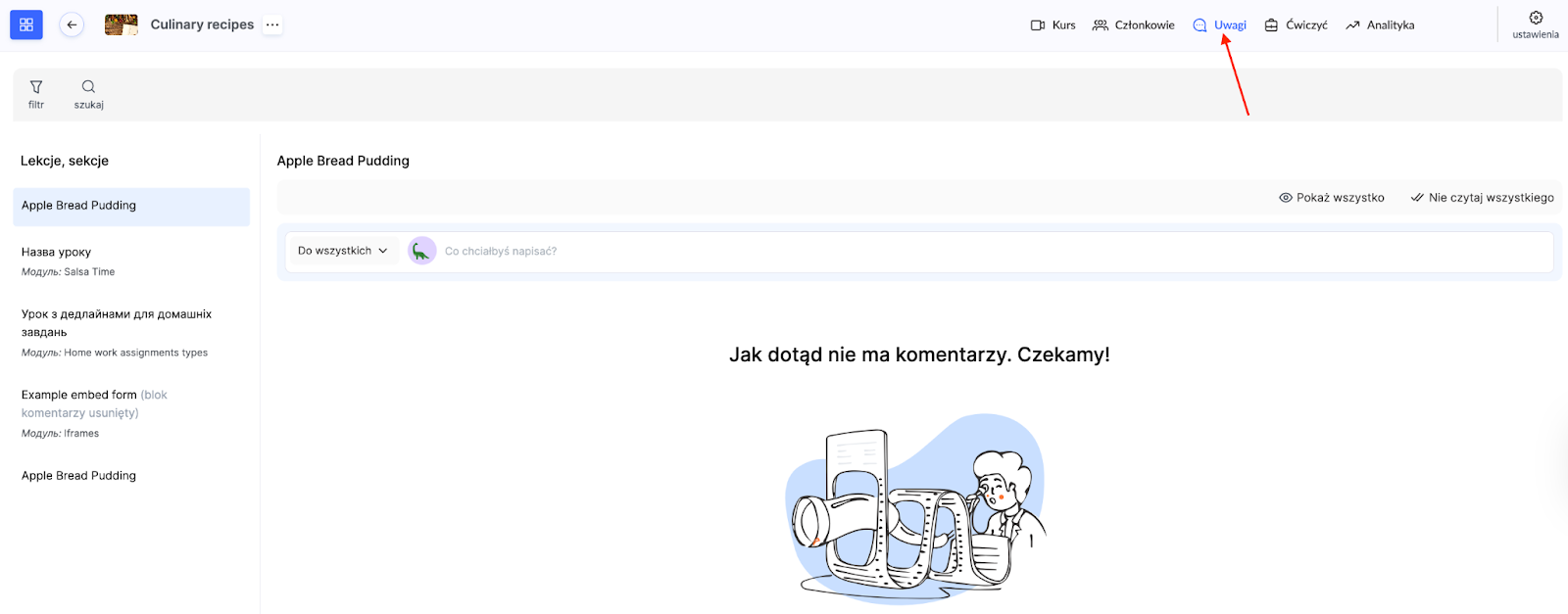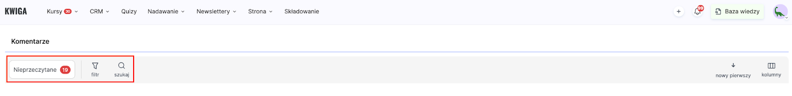Tutaj zobaczysz komentarze ze wszystkich swoich kursów w jednym miejscu. Dla szybkiego dostępu do nowych wiadomości dostępny jest filtr Nieprzeczytane.