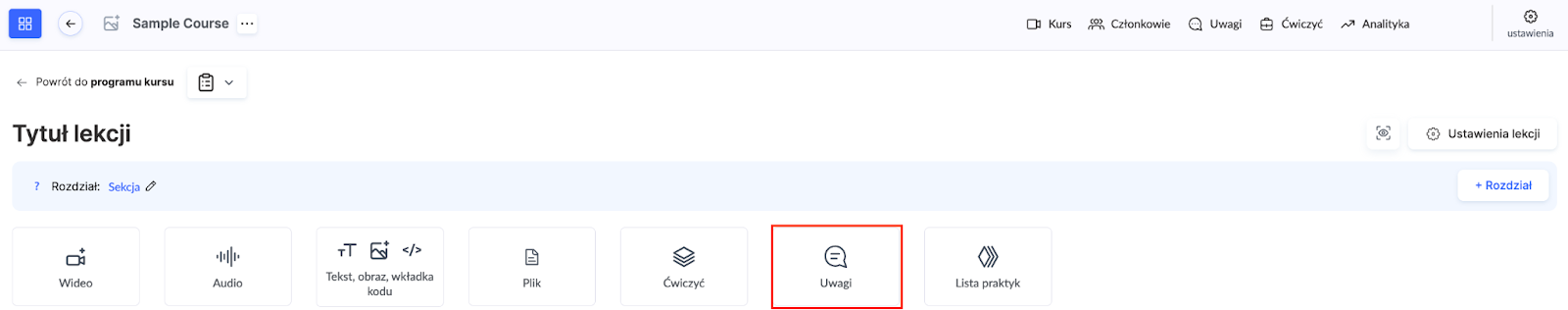 Aby dodać blok komentarzy, otwórz kurs, przejdź do odpowiedniej lekcji i za pomocą przycisku Uwagi dodaj blok do wprowadzania komentarzy w wybranym miejscu.