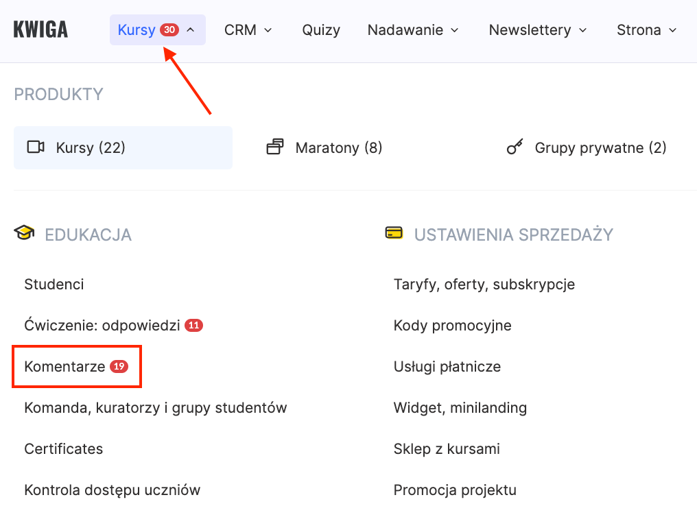 W kursie znajduje się specjalne menu Uwagi, w którym można przeglądać wszystkie dodane komentarze, moderować je lub odpowiadać uczestnikom bezpośrednio w kontekście lekcji.