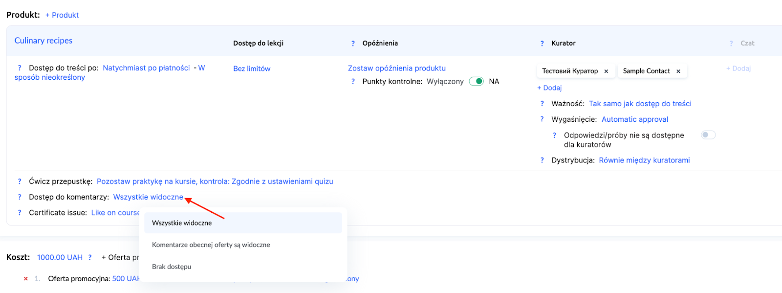 Dostęp do komentarzy można włączyć lub wyłączyć w ustawieniach ofert. Daje to nauczycielom elastyczność — samodzielnie decydujesz, czy chcesz korzystać z tego narzędzia w danym kursie. Na przykład w jednym planie taryfowym można włączyć dostęp do komentarzy, a w innym nie.