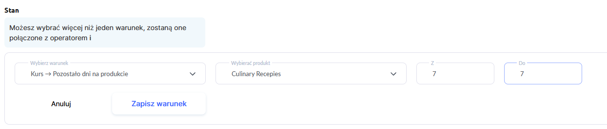 Stan — Pozostało dni na produkty, następnie wybierz nazwę produktu, podaj liczbę dni i zapisz warunek.