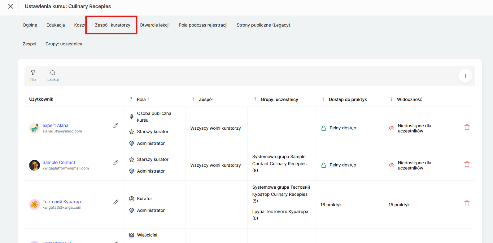 Brak dostępu – pełna izolacja kuratora od uczestników; przydatna opcja dla kuratorów technicznych, którzy wykonują zadania administracyjne bez bezpośredniego kontaktu ze studentami.