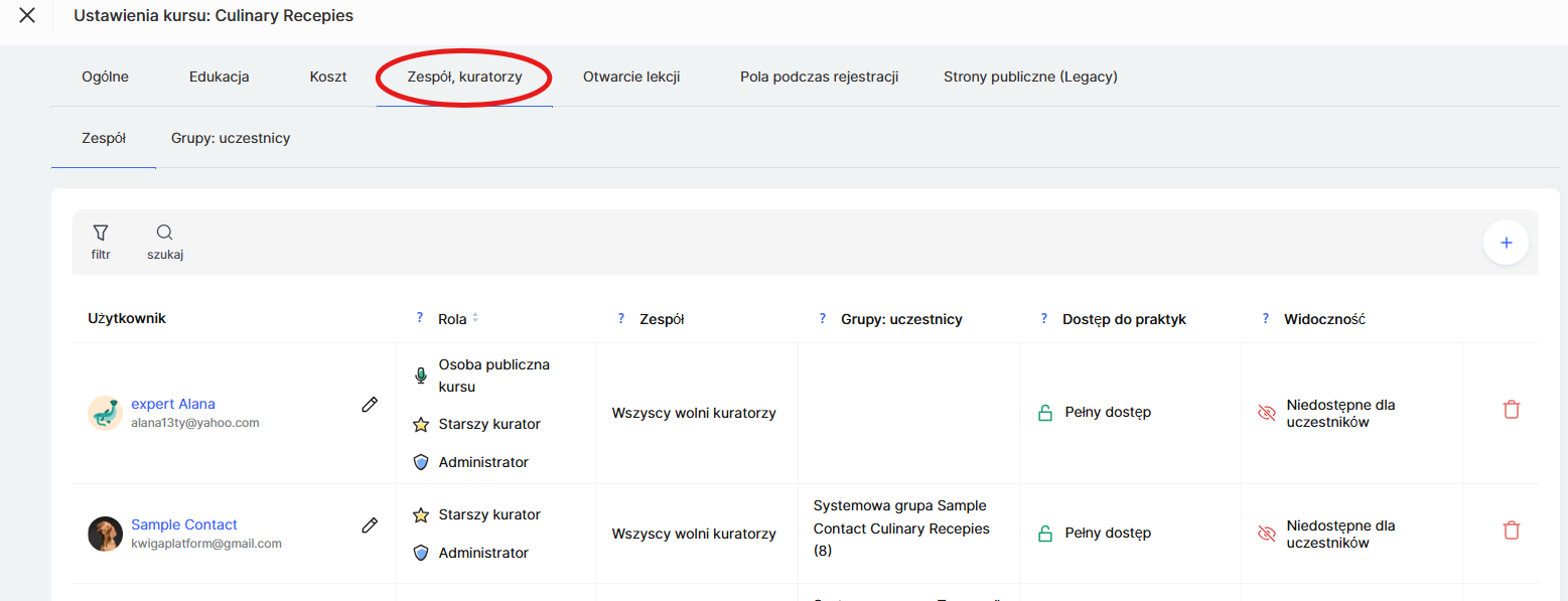 Albo bezpośrednio w ustawieniach kursu, w zakładce Zespół, kuratorzy — Zespół.