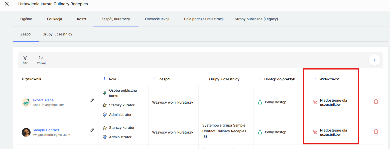 Ustawienia widoczności dokonuje się przez menu Kursy → Komanda, kuratorzy i grupy studentów na karcie Zespół