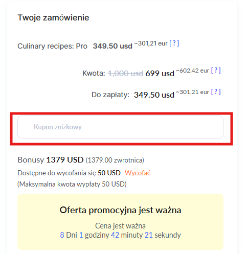 Jeśli utworzyłaś/eś kupony rabatowe i zezwoliłaś/eś na ich użycie dla tej oferty, na stronie pojawi się specjalne pole do wpisania kodu promocyjnego.