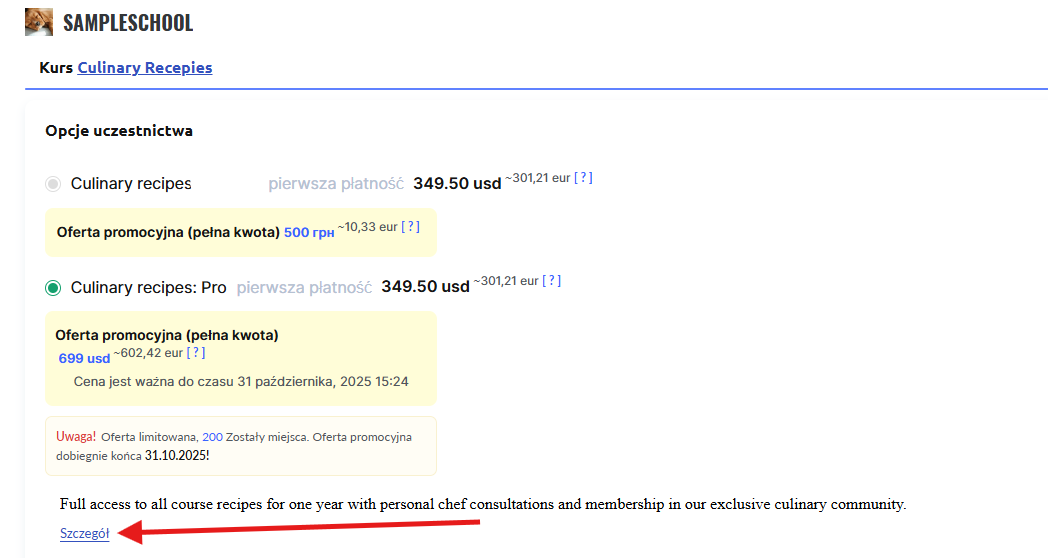 Jeśli utworzysz ofertę promocyjną z rabatem, uczniowie zobaczą obniżoną cenę pogrubioną, a obok niej — starą cenę przekreśloną. Taki wizualny efekt podkreśla korzyść z zakupu właśnie teraz.