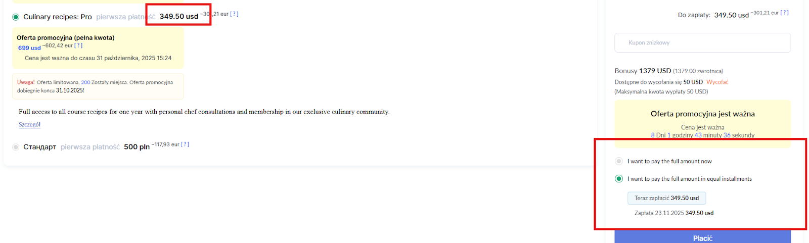 Gdy włączona jest opcja płatności punktami, studenci widzą możliwość wykorzystania zgromadzonych punktów bonusowych, aby obniżyć koszt swojego zakupu.