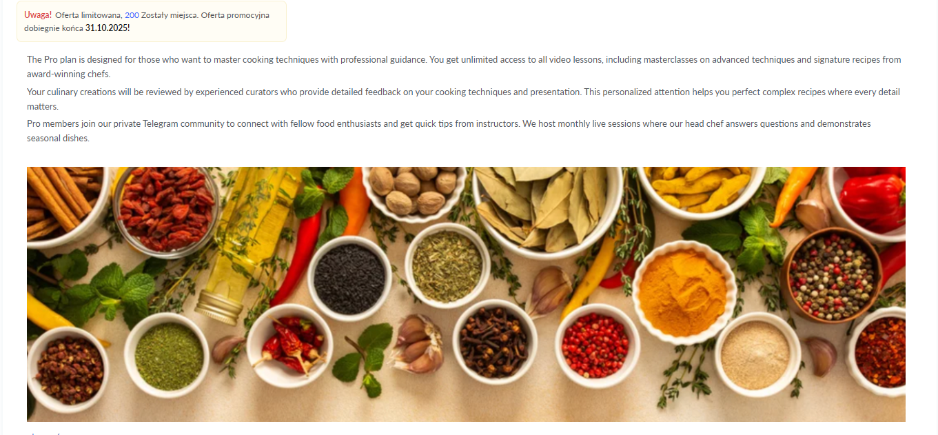 Jeśli w ustawieniach oferty określono limit liczby dostępnych miejsc, na stronie pojawi się informacja o tym, ile miejsc pozostało z ogólnej puli. Taki komunikat tworzy poczucie ekskluzywności i dodatkowo motywuje do szybkiego zakupu.