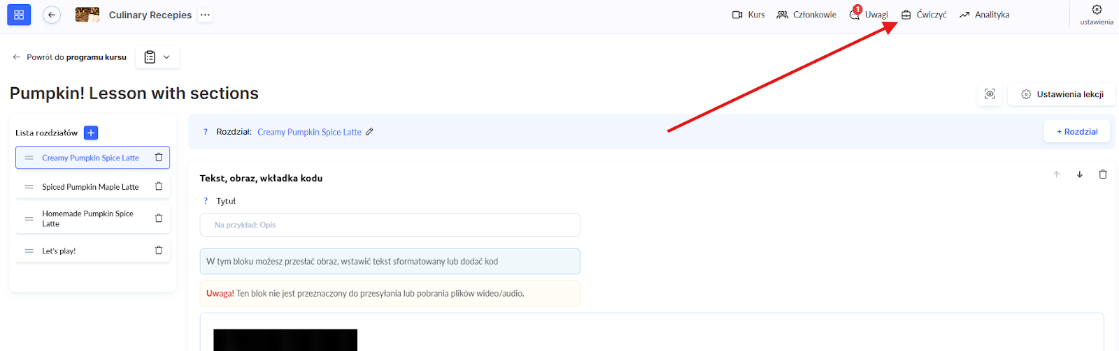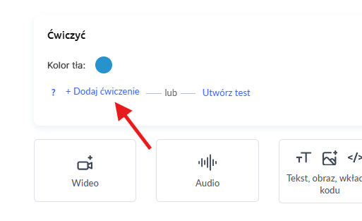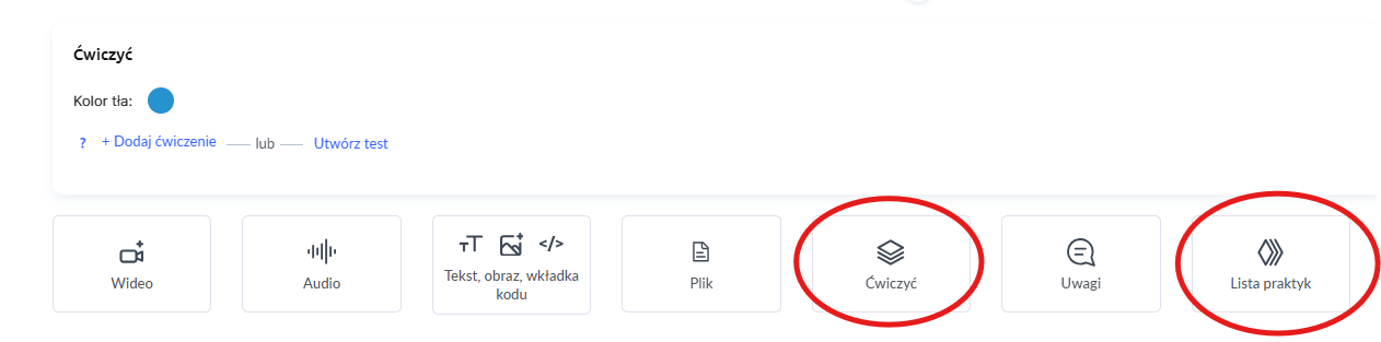 W edytorze lekcji dodaj zadanie za pomocą przycisku „Praktyka” lub wybierz opcję „Lista praktyk”.