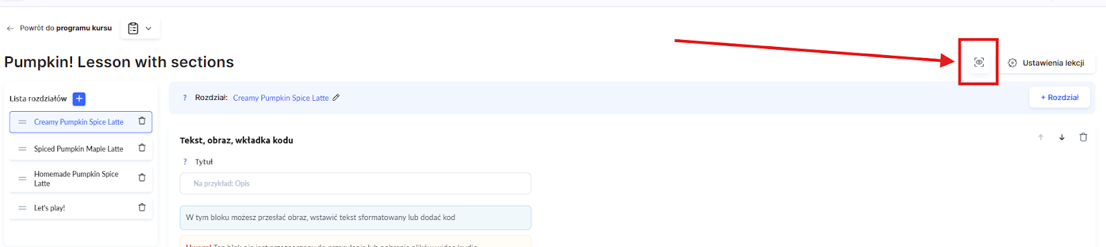 Na górze kliknij przycisk „Podgląd kursu” — to ikona obok ustawień lekcji.