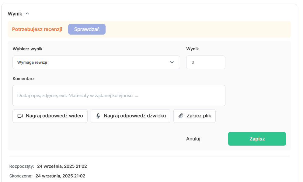 Zaleca się zostawienie komentarza dla studenta — wyjaśnienie, co zostało wykonane dobrze, a co można poprawić. Do opinii możesz również dołączyć plik audio, wideo lub inne załączniki.
