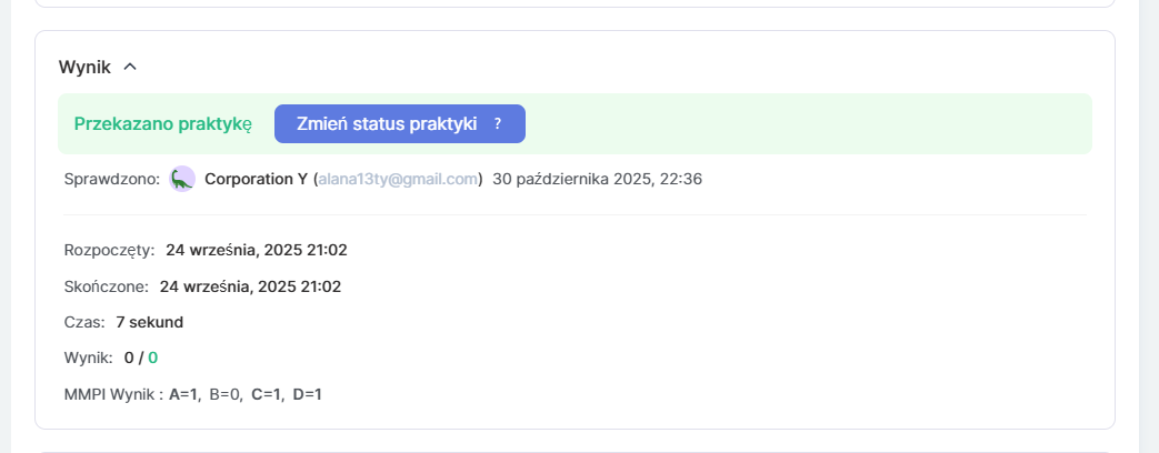 Po sprawdzeniu status praktyki zostaje zaktualizowany, a Ty możesz zobaczyć, kto i kiedy przeprowadził ocenę.