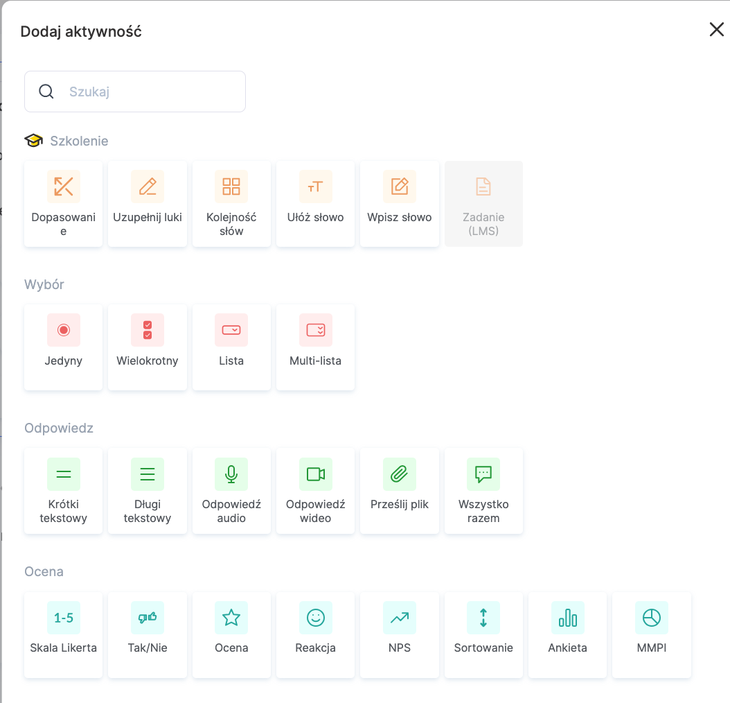 Możesz korzystać z testów z jedną lub kilkoma odpowiedziami, zadań na dopasowanie, uzupełnianie luk, sortowanie lub interaktywnych ćwiczeń, takich jak układanie słów czy zdań.