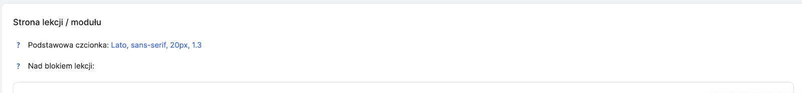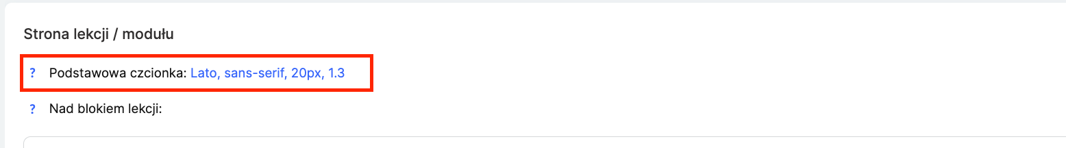 Aby skonfigurować, przejdź do ustawień kursu na zakładkę Strony publiczne, przewiń w dół do bloku Strona lekcji / modułu – pozycja Czcionka podstawowa.