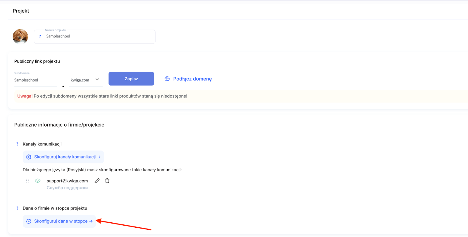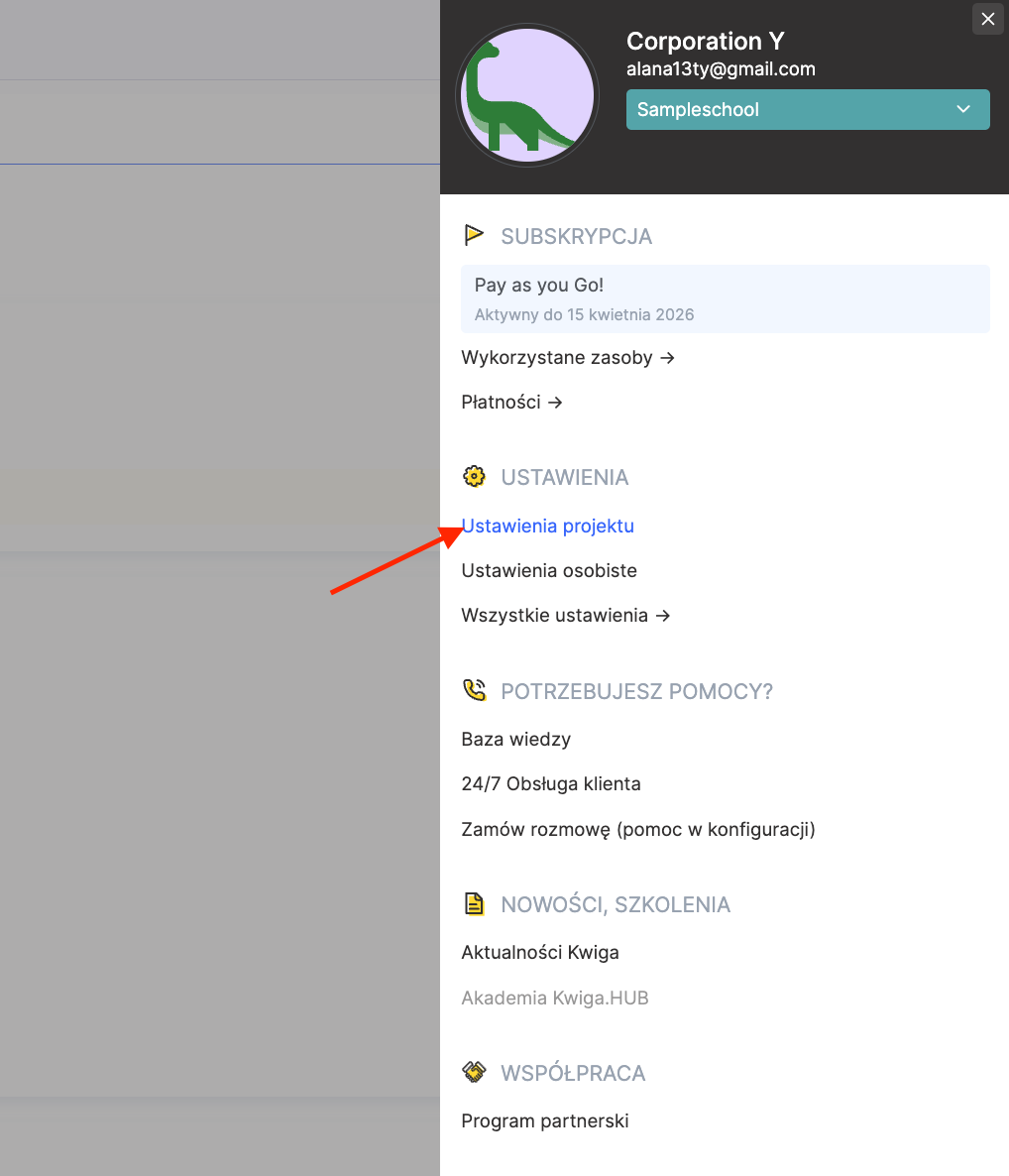 Aby skonfigurować stopkę, przejdź przez awatar profilu do sekcji Ustawienia projektu.