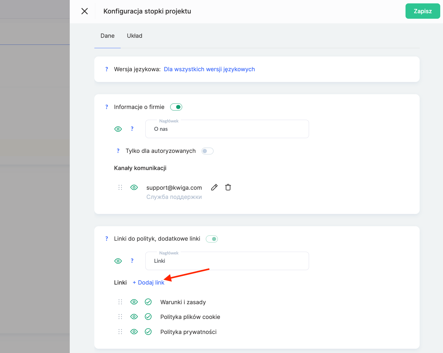 System umożliwia konfigurację wersji językowych dla międzynarodowej publiczności, włączanie lub wyłączanie bloku Informacje o firmie, a także dodawanie własnych linków za pomocą przycisku Dodaj link.