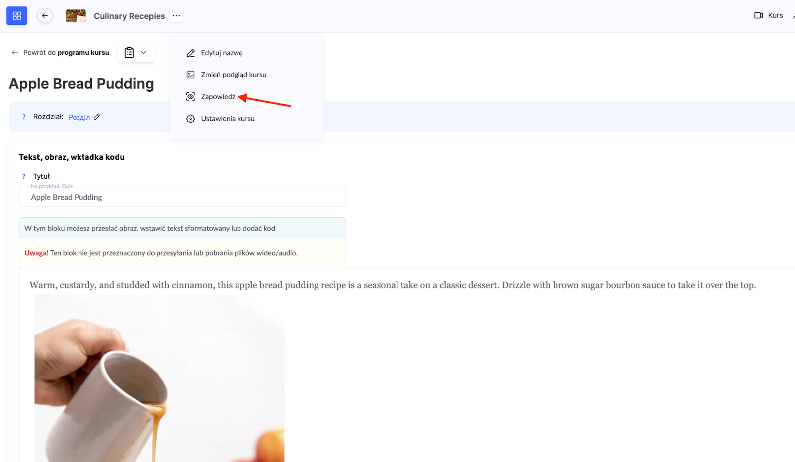 Przed uruchomieniem kursu ważne jest, aby sprawdzić, jak będą go widzieć studenci. W tym celu na platformie przewidziano funkcję Zapowiedź, która pozwala ocenić projekt, sprawdzić poprawność wyświetlania materiałów i upewnić się, że struktura kursu jest wygodna dla użytkowników.