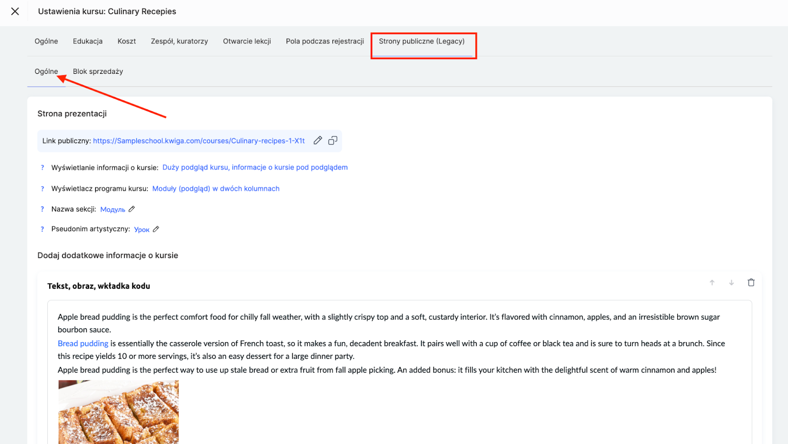 Aby go dodać, przejdź do ustawień kursu na zakładkę Strony publiczne, przewiń w dół do bloku Strona lekcji / modułu – pole Blok nad lekcją.