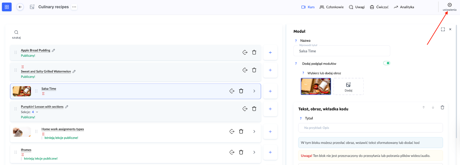 Aby ustawić opóźnienia, przejdź do ustawień kursu lub wyjdź z edytora pojedynczej lekcji. Otwórz Ustawienia