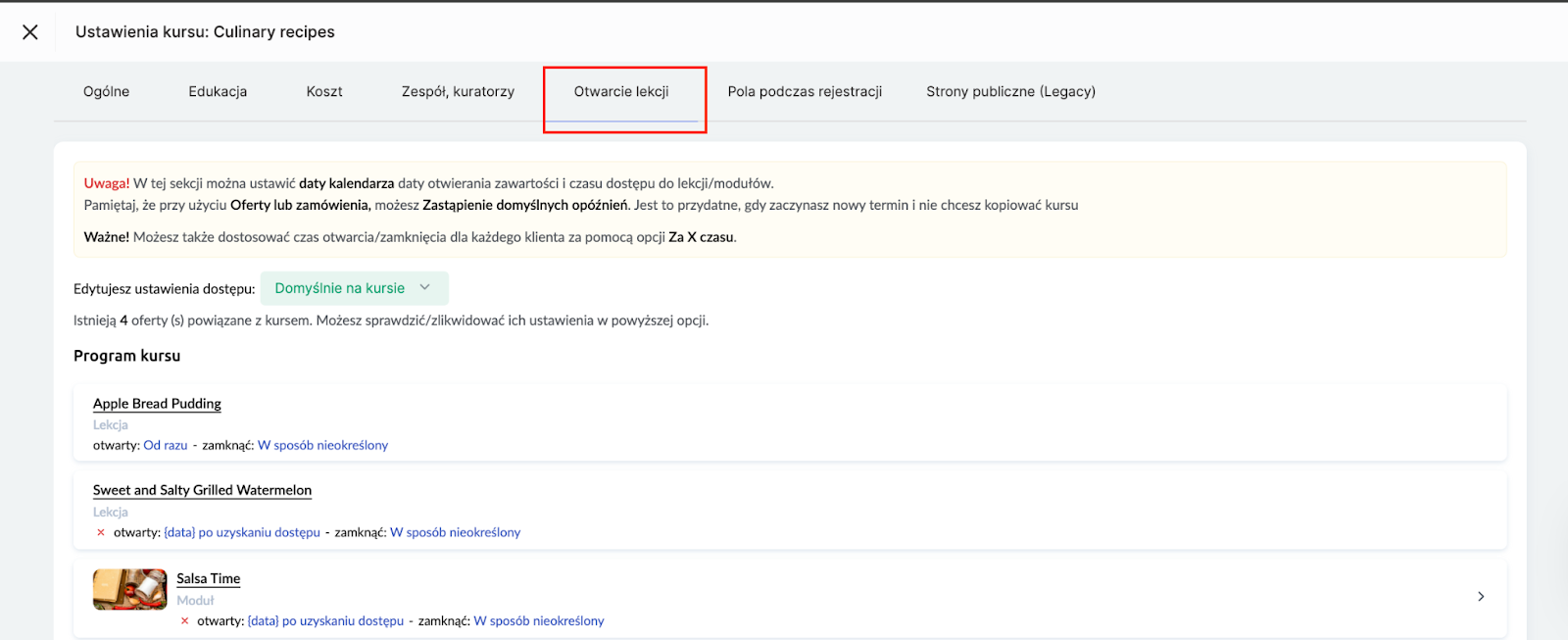 Uwaga: Jeśli dostęp do kursu jest ograniczony czasowo (np. przez dwa miesiące), zaleca się zarządzanie zamknięciami za pomocą ofert zamiast ustawiania dat zamknięcia dla każdej lekcji lub modułu. Takie podejście ułatwia przedłużanie dostępu dla uczestników.
