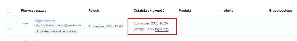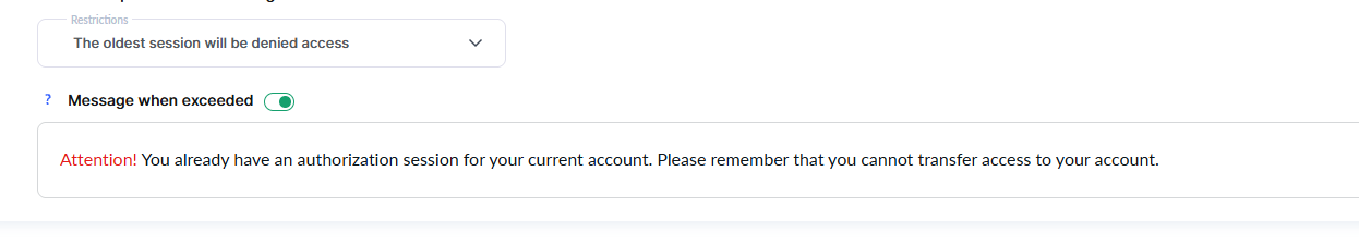 Starsza sesja traci dostęp – uczeń, którego sesja jest starsza, zostanie wylogowany z konta. Jeśli spróbuje zalogować się ponownie, automatycznie wyloguje się z innej sesji. Dodatkowo możesz ustawić powiadomienie, które zobaczy klient.