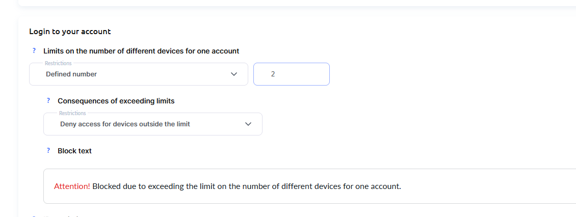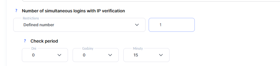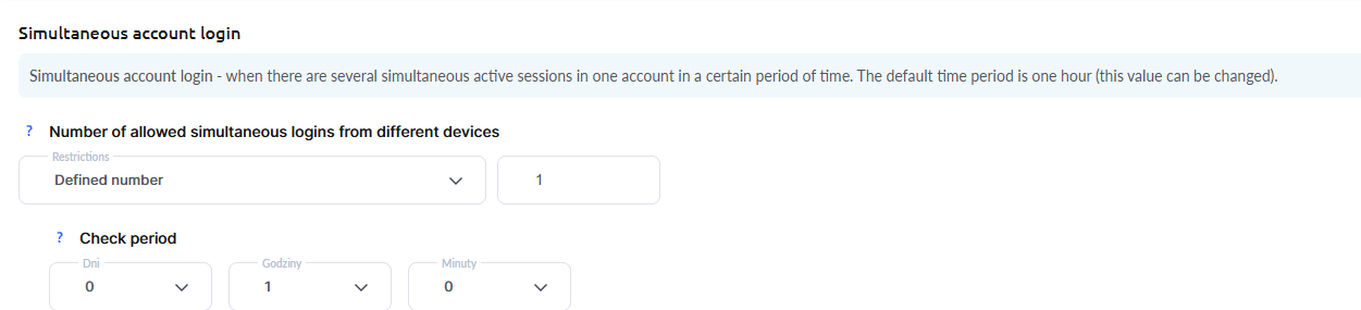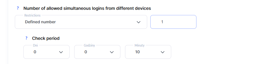 W tej sekcji możesz określić liczbę jednoczesnych logowań z różnych urządzeń w podanym okresie czasu. W tym ustawieniu będzie uwzględniane jako oddzielna sesja również logowanie w różnych przeglądarkach na jednym urządzeniu. Na przykład, jeśli uczeń otworzy kurs w przeglądarce Chrome, a następnie zechce otworzyć go na tym samym telefonie w przeglądarce Safari – zostanie to uznane za 2 różne jednoczesne logowania.