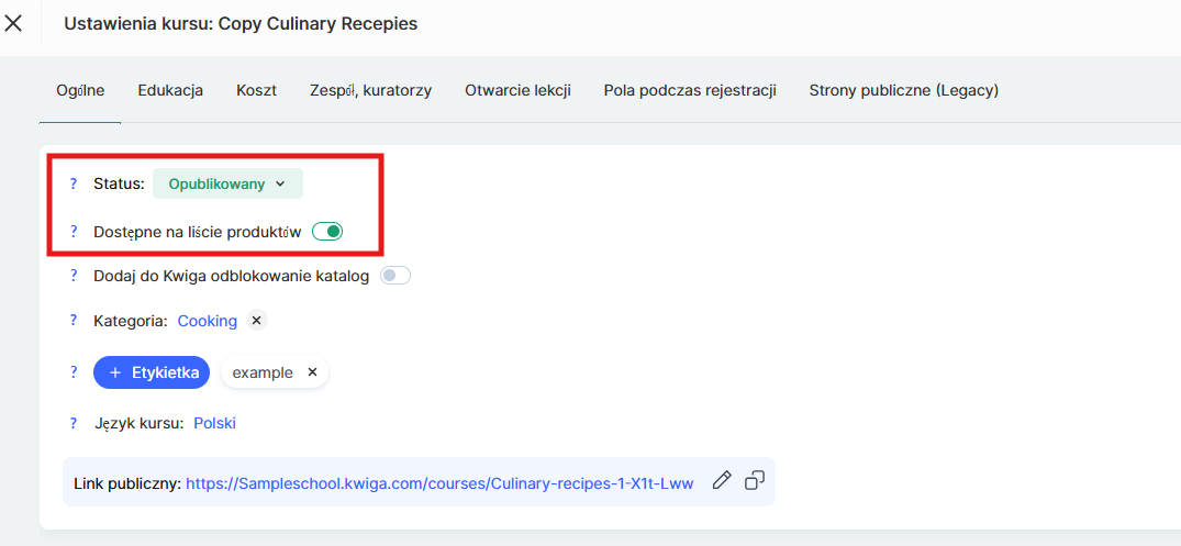 Status kursu musi być ustawiony na Opublikowany — tylko wtedy kurs będzie dostępny dla użytkowników. Ważne jest również włączenie zielonego przełącznika Dostępny na liście produktów.