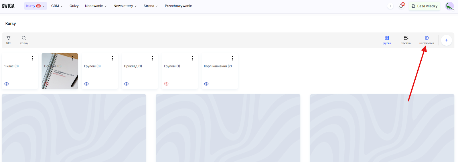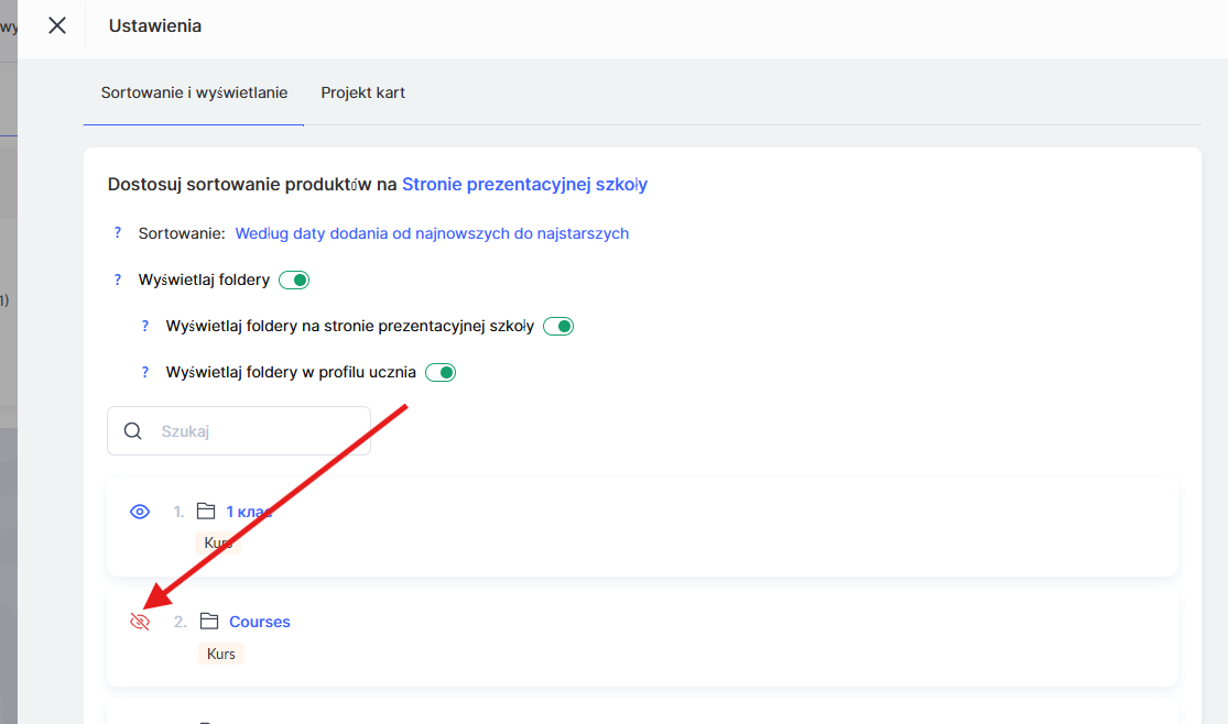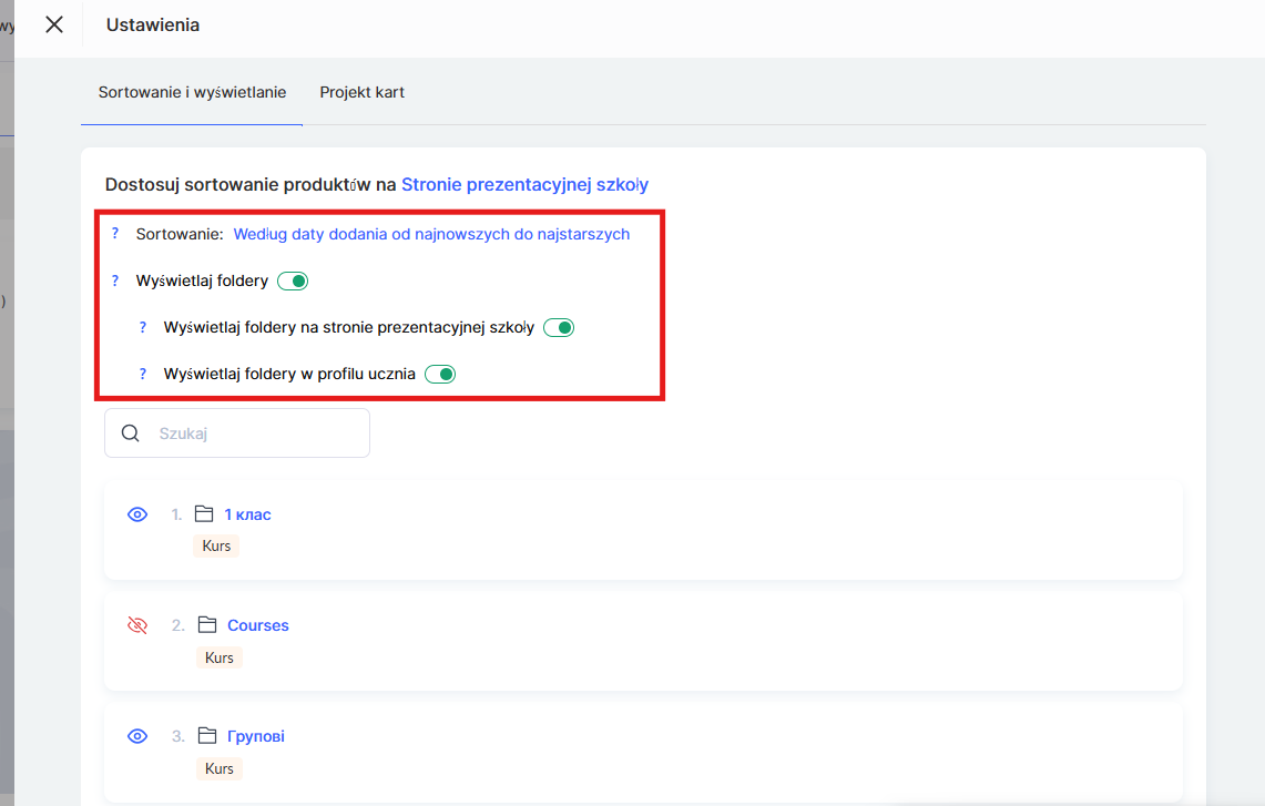 Jeśli foldery zostały już utworzone i chcesz skonfigurować sposób ich wyświetlania na stronie projektu lub w panelu studenta, przejdź do menu Kursy, otwórz odpowiednią sekcję w bloku Produkty i kliknij Ustawienia.