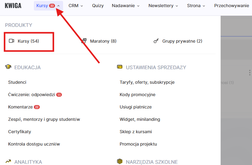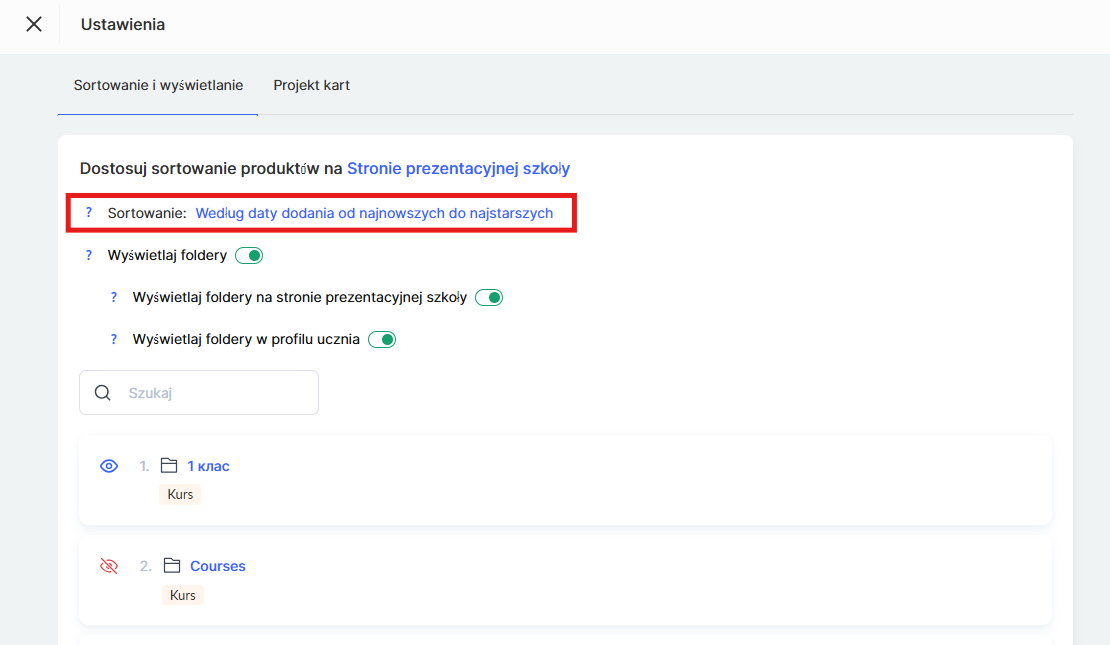 Kolejność wyświetlania można zmienić ręcznie. W tym celu przejdź do menu Kursy i otwórz jedną z sekcji w bloku Produkty, na przykład Kursy.