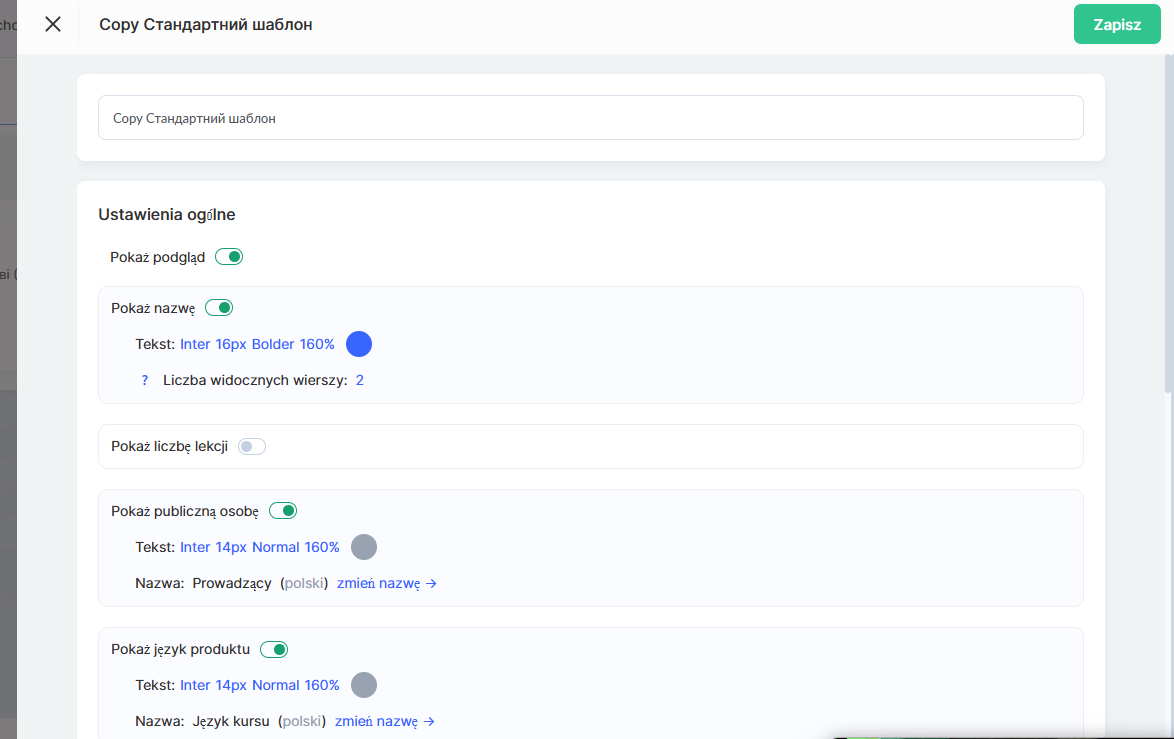 Uwaga: Ustawienia wyglądu kart produktów wpływają na sposób wyświetlania kart na stronie prezentacyjnej szkoły oraz na publicznej stronie kursu. Tutaj możesz wybrać, jakie informacje mają być widoczne na karcie (tytuł, autor, cena, tagi itp.).
