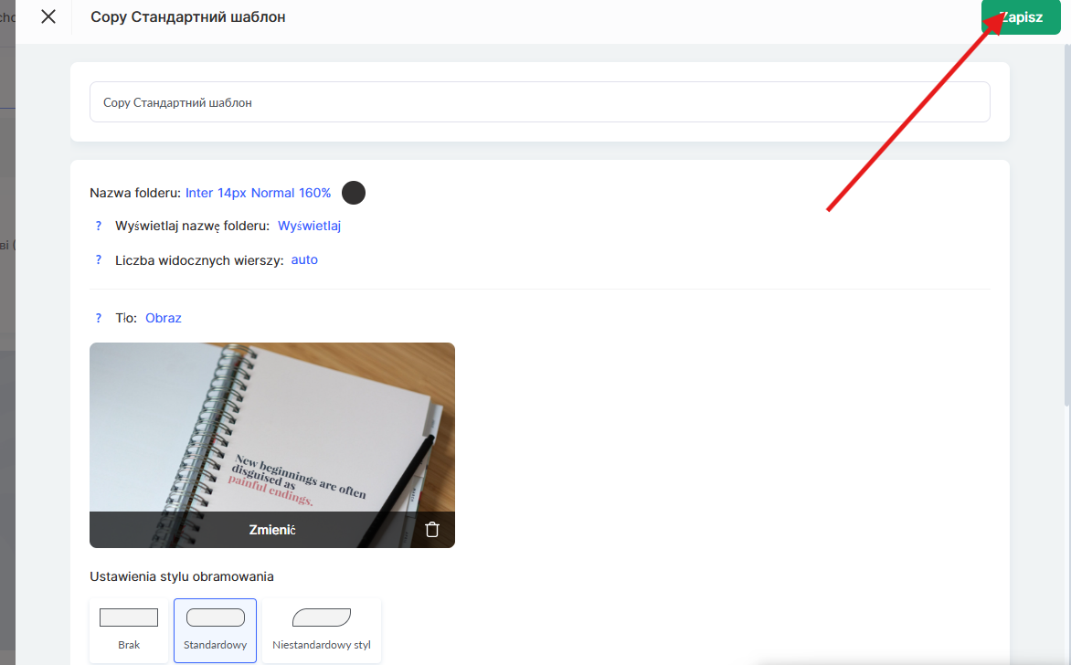 W edytorze szablonu możesz skonfigurować sposób wyświetlania nazwy folderu.