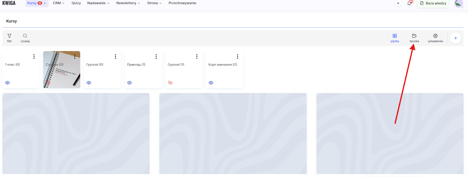 Jeśli nie masz jeszcze folderów, należy je utworzyć. W tym celu przejdź do menu Kursy, otwórz jedną z sekcji w bloku Produkty (na przykład Kursy) i kliknij przycisk +Folder.