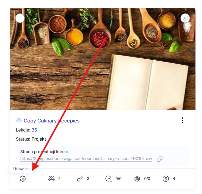 W tym celu przejdź do menu Kursy, znajdź wymagany produkt i otwórz Ustawienia kursu w zakładce Kurs.