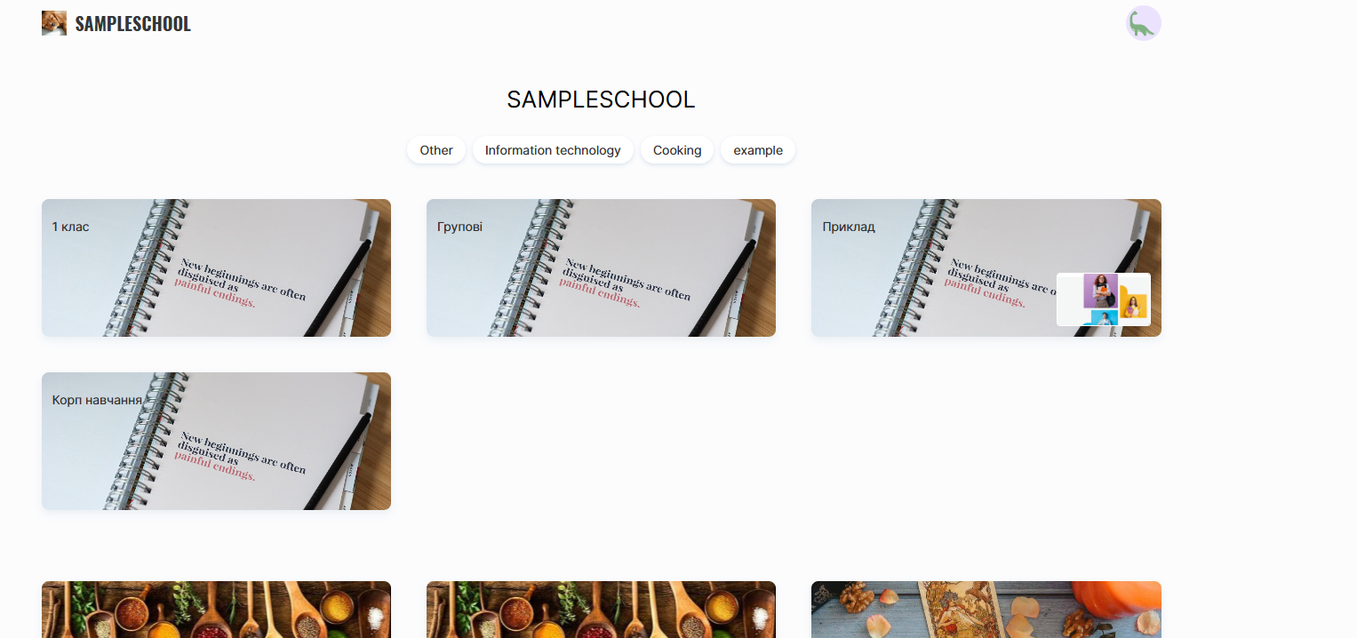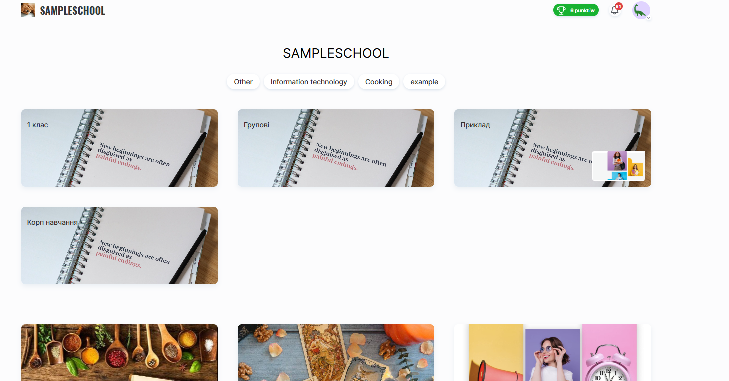 Na platformie Kwiga każdy projekt edukacyjny (szkoła) otrzymuje własną stronę prezentacyjną. Jest to swego rodzaju strona startowa szkoły, na której wyświetlane są opublikowane produkty.