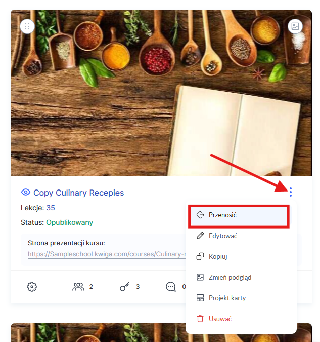 Następnie możesz dodać kursy do folderu — w tym celu wybierz Przenieś w menu z trzema kropkami na karcie kursu.
