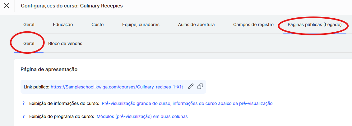 Na guia Páginas públicas, selecione a seção Geral e role para baixo até Página da Lição / Módulo.