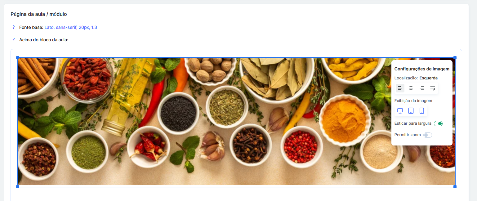 Se você adicionar uma imagem ao bloco acima das lições, poderá ajustar como ela será exibida em diferentes dispositivos.