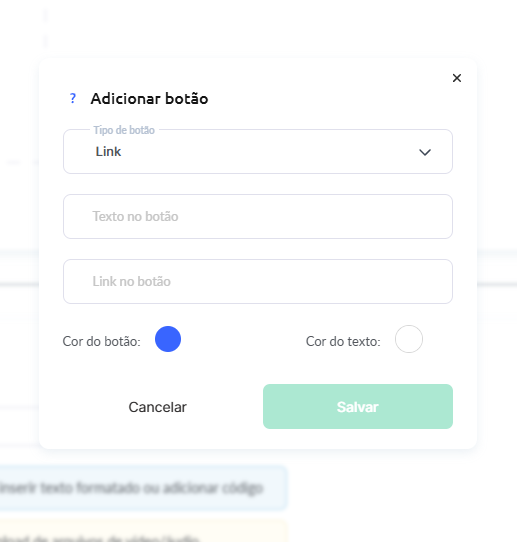 No menu que se abre, você pode adicionar um link, definir o nome do botão e personalizar a cor do botão e do texto. Clique em Salvar e o botão será adicionado à sua aula!