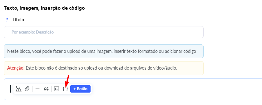 Abra a aula onde deseja adicionar um botão e insira o elemento “Texto, Imagem, Inserção de Código”. Clique na área onde deseja colocar o botão e selecione +Botão na barra de ferramentas do editor de texto.