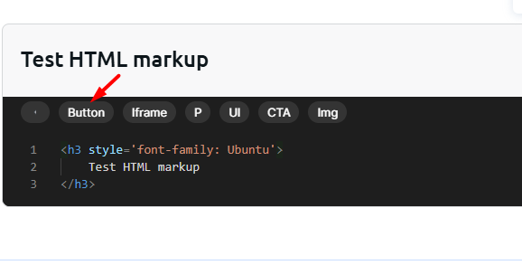 O editor de código será aberto (uma área preta na tela) e, na parte superior do menu, você verá botões para adicionar modelos de código prontos. Para criar um botão, selecione Botão: